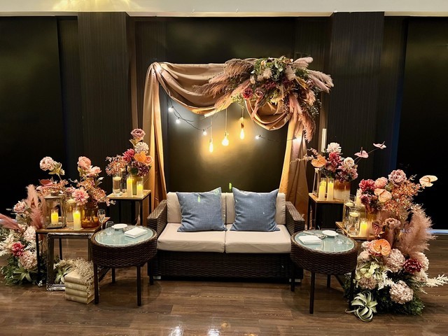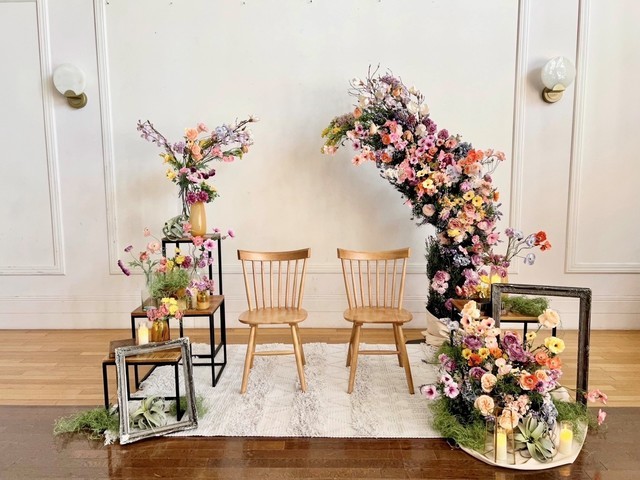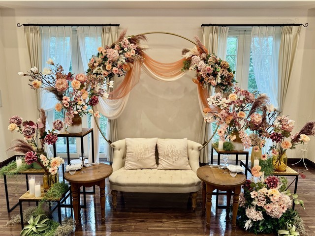 高砂装飾はアーティフィシャルフラワー、ドライフラワー、フェイクグリーン、装飾小物などを組み合わせ写真映えする空間をご提供いたします。